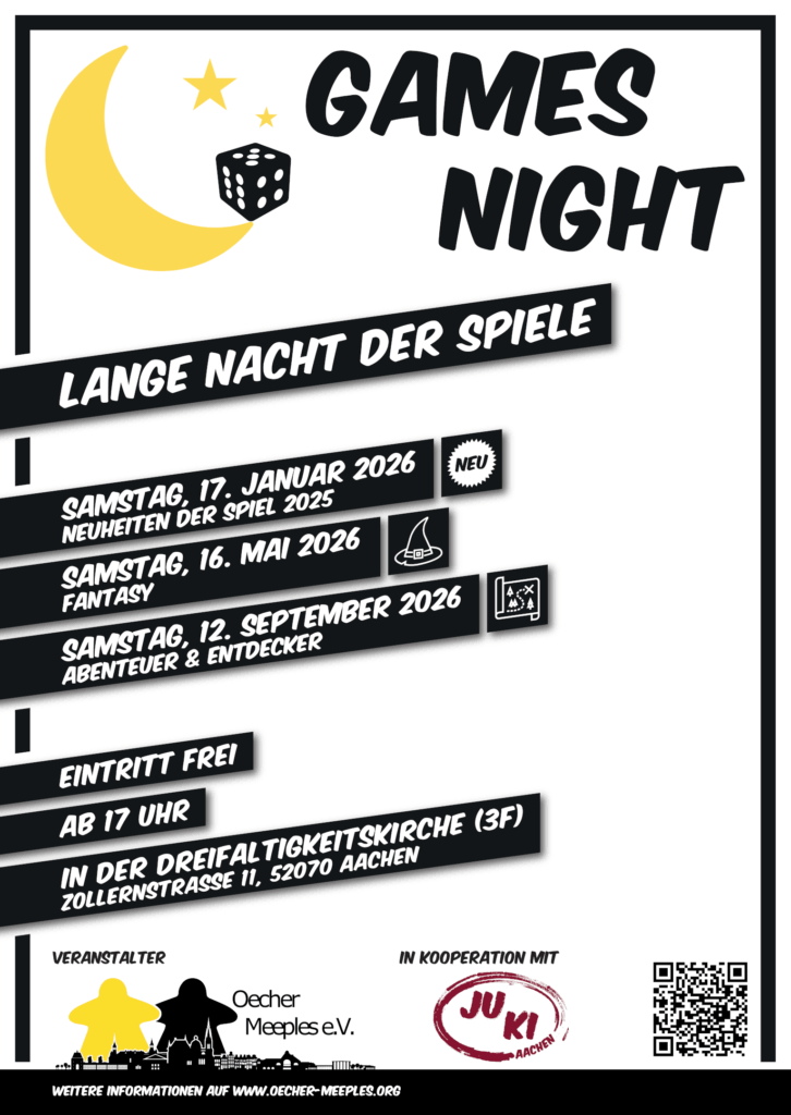 In Kooperation mit der Juki finden unsere kommenden Games Nights am 17.01.2026 mit dem Thema Neuheiten der Spiel 2026, 16.05.2026 mit dem Thema Fantasy und am 12.09.2026 mit dem Thema Abenteuer & Entdecker statt.